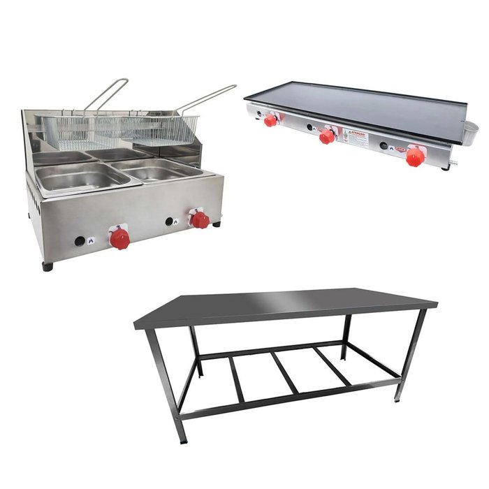 Esse Kit conta com Mesa de Manipulação para você preparar os alimentos, Fritadeira para fritura de suas porções e uma Chapa para preparação do seu cardápio!