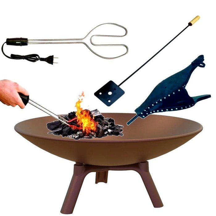 Kit Lareira Ferro Envelhecida Acendedor 110v Fole EspalhadorA lareira de jardim em ferro fundido é extremamente resistente e suporta altíssimas temperaturas. Aqueça ambientes internos e externos com está lareira dando conforto térmico além de ser uma linda peça decorativa, charmosa e prática. Pode ser usada como combustível a lenha, carvão, pedras vulcânicas ou até mesmo carvão ecológico, que não faz fumaça. Ideal para chácaras, pousadas, hotéis, fazendas e ou até mesmo no conforto de sua casa.Um excelente espalhador de carvão, ideal para churrasqueiras, fornos, fogões a lenha, lareiras e outros. Auxilia no controle da temperatura. Com cabo de madeira para não esquentar. Produzido em tubo e chapa de ferro maciço para maior durabilidade. Pintura eletrostática resistente a sol e chuva.Acendedor elétrico para churrasqueiras e lareiras grande. O mais potente do ML 800w de potência, é a maneira mais fácil, rápida e segura de acender sua lareira não precisa mais aquelas ?técnicas infalíveis? como pano com álcool, papéis picados entre outras que dão muito trabalho e fazem muita sujeira. Com a acendedor elétrico sua lareira estará acesa em apenas 5 minutos e sem trabalho para você. Basta colocar o acendedor dentro da lareira, despejar o carvão em cima da zona de aquecimento do aparelho e ligar na tomada, após 5 minutos seu carvão estará em brasas, é a maneira mais prática e econômica de acender sua lareira.Excelente Soprador Manual Fole Para Carvão. Você consegue potencializa a chama em questão de minutos. Fabricado em Madeira e Couro.Especificações Técnicas Lareira: