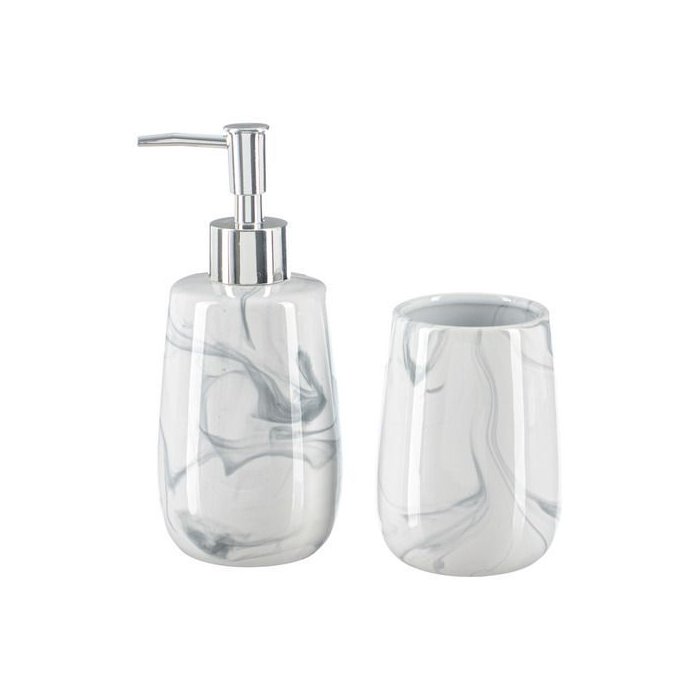 Adicione um toque de elegância e sofisticação ao seu banheiro com este lindo kit de 2 peças feito em porcelana com acabamento marmorizado. Perfeito para deixar o ambiente mais moderno e requintado.