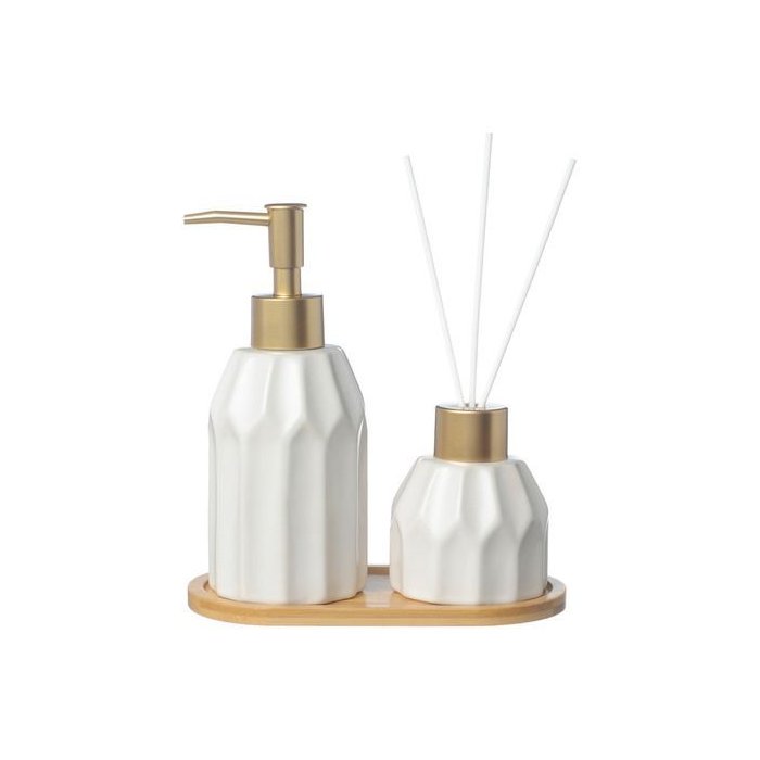 Um lindo kit para banheiro com design moderno e sofisticado. Ideal para manter a pia de seu banheiro ou lavabo organizada e com um toque elegante. O conjunto inclui um dispenser para sabonete líquido e um recipiente para difusor de aromas, acompanhados por uma bandeja.