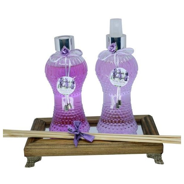 Kit Lavanda Luxo BandejaA Lavanda combinada com um toque de Figo, que possui notas frutais modernas e exóticas, traz Harmonia ao ambiente,Frescor e Tranquilidade, incentivando a Ternura e a Amorosidade. Combate a insônia e Estimula o Cérebro. Ajudando na Concentração.Deixe seu ambiente delicado e Perfumado com esse lindo Kit de Lavanda. Itens: 1 Difusor 240 ml 1 Home Spray 240 ml 1 Bandeja 1 papel celofane e fita p/ embrulho Detalhes Difusor de ambiente Acompanha Varetas Retire a tampa e o batoque, coloque a tampa de volta e insira as varetas no frasco.Vire as varetas dia sim dia não Dica: Utilize todas as varetas, quanto menos espaço aberto, menos seu produto irá evaporar.Quanto mais abertas suas varetas estiverem, mais irá espalhar a fragrância.Caso seu ambiente tenha mais de 30 m2, colocar pelo menos 2 difusores.Home Spray Borrifar o produto no ambiente com o spray direcionado para superfícies como móveis, tapetes, cortinas e parede a uma distância de aproximadamente 50 cm.Material Embalagem: Frasco: Vidro de 240 ml Bandeja : Madeira ou Espelho Precauções Em caso de sensibilização da pele, suspender o uso.Armazenar em local fresco e arejado.Manter fora do alcance das crianças e animais domésticos. Evitar contato com os olhos.