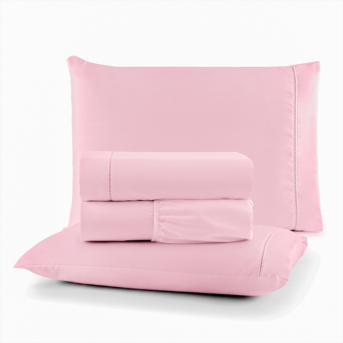 Kit Lençol de Cama Casal com Elástico e Fronha 200 Fios Algodão 4 Peças Ponto Palito Anti-pilling To Rosa Claro