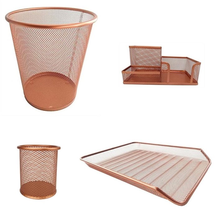 Kit Escritório Lixeira Redonda Metal Aramado 12 litros Rose Gold, Bandeja Organizadora de Papel A4 Porta Lápis Caneta Treco 3 Divisórias e 1 Porta Treco