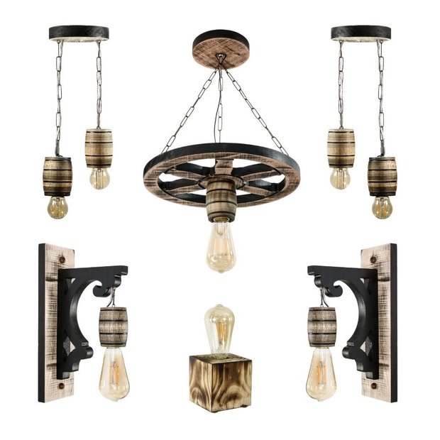 Kit de Iluminação Rústica em Madeira Maciça - 1 Pendente Roda de Carroça, 2 Pendentes Barril, 2 Arandelas e 1 Luminária de Mesa Cubo