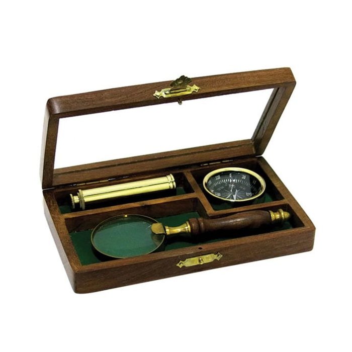 Kit Lupa De Aumento - Bussola - Luneta Em Estojo de Madeira Luxo MEI0007