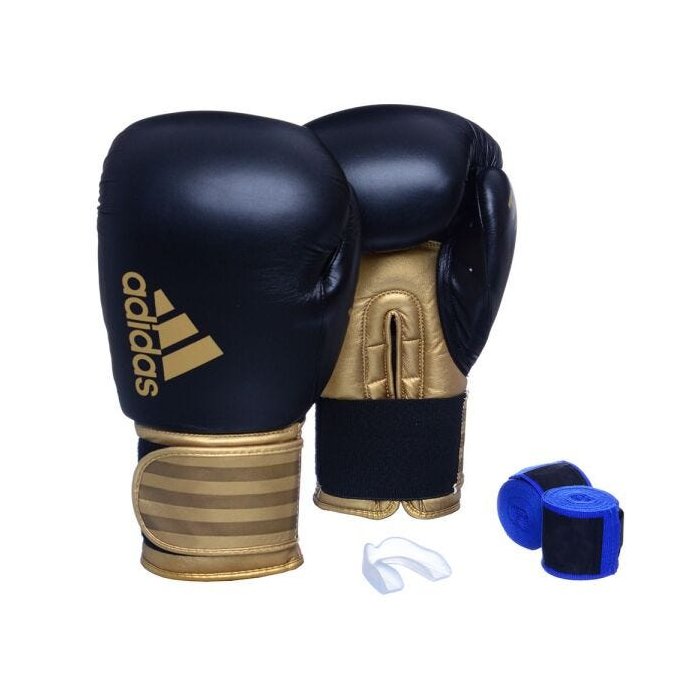 Kit Luva Boxe Adidas Hybrid 100 Preta/Dourada com Bandagem Azul e Bucal Simples - 12 Oz