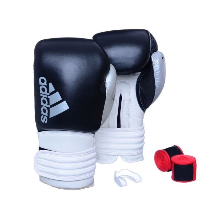 Kit Luva Boxe Adidas Hybrid 300 Preto/Branco com Bandagem Vermelha e Bucal Simples - 16 Oz