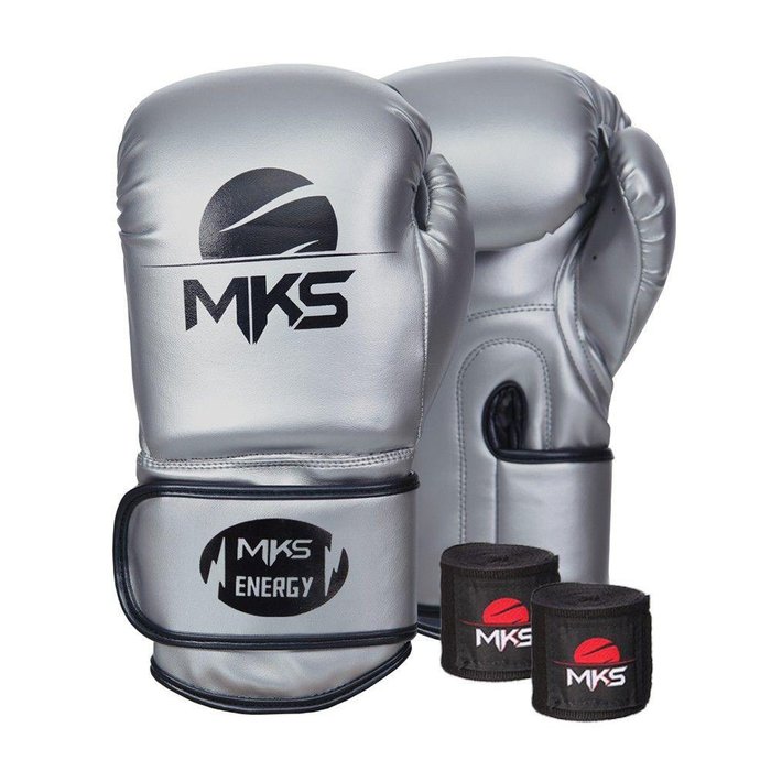 Kit Luva De Boxe Mks Energy V2 Silver E Bandagem Preta 2,55m 10ozA luva de boxe MKS Energy II atende aos atletas amadores e profissionais que querem o máximo de performance para treinar na academia e até competir no mais alto nível dos esportes de combate. Indicada para boxe, muay thai, kickboxing, savate e sanda. batizamos essa luva de boxe como Energy II e em cores vibrantes para homenagear todos que dão toda sua energia nos treinos. só na MKS você tem essas cores exclusivas. Características técnicas: luva de boxe MKS Energy II:- Material de revestimento: P.U. (Poliuretano, resistente e elástico)- Espuma extra de gel injetada- Punho estendido, em formato “V”, para proteção de golpes do muay thai- Ventilação básica na palma das mãos- Velcro elástico resistente- Elástico entre dedão e demais dedosBandagem MKSProteger as mãos é essencial e requer atenção e um produto de qualidade. A bandagem elástica serve para evitar principalmente lesões ósseas e ligamentares nos nós dos dedos e nos punhos. Outros benefícios são a redução do desgaste do forro interno e a absorção do suor, evitando assim o mau odor.Não saia por aí distribuindo socos sem enfaixar as mãos. Previna-se e treine por muito mais tempo, com conforto e segurança. A bandagem da MKS é feita com material elástico, que ao ser enrolado nas mãos e punho garante total segurança e permite o ajuste ideal para não prender a circulação sanguínea. O velcro é resistente até àqueles que mais transpiram, não perde a cola e nem solta fios.CARACTERÍSTICAS TÉCNICAS DA BANDAGEM ELÁSTICA MKS- Material: Algodão com elástico, Fechamento: fita dupla aderente, Medidas: 5cm x 255cm (5cm de largura e 2,55m de comprimento)