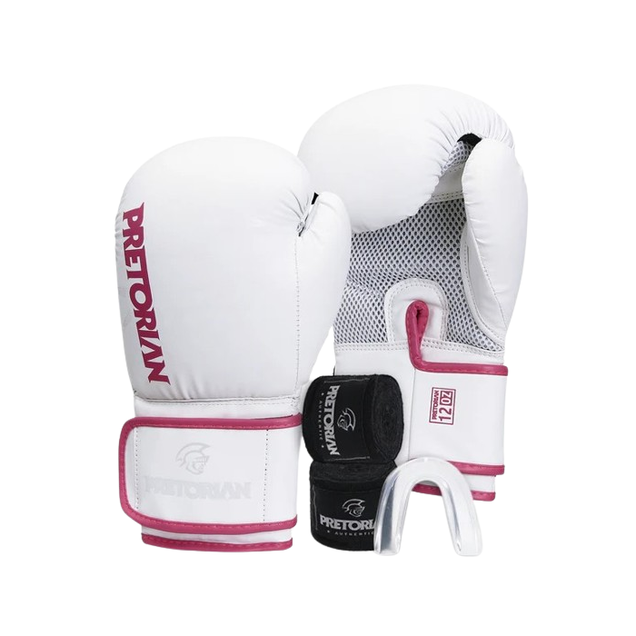 Kit Luva de Boxe Muay Thai Pretorian Firts FX- 2 + Bandagem e Protetor Bucal - Branco/Rosa