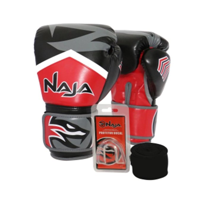 O Kit Luva Naja New Extreme Vermelho OKit Luva New Extreme Naja contém 3 itens:01 Luva First Preta01 Protetor Bucal Moldavel (generico)01 Par Bandagem Preta 2,5mts (one sport)Luva New Extreme ALuva modelo OPP Preta possui revestimento em couro sintético e enchimento emN.T, que oferece precisão no molde para um encaixe perfeito. Estudosinternacionais científicos resultam numa matéria-prima inovadora para o melhorenchimento da luva. O material além de tudo amortece o impacto e dá ao atletasegurança. Limpe com pano úmido sem utilizar produtos químicos. Protetor BucalOProtetor Bucal Simples Transparente não é tóxico, é feito em material avançado(100% Etil Vinil Acetato), leve e resistente, ideal para MMA, Muay Thai e Boxeproporcionando proteção máxima para você em todos os treinos. Moldagemtermo-ajustável, atendendo os padrões internacionais. BandagemABandagem Preta fabricada em Spandex e Algodão, ideal para atletas que buscamperformance e conforto. Tamanho:2,30 metros de comprimento e 5 centímetros de larguraEspecificações Técnicas-Produzido com couro sintético premium.- Tratamento Anti-Microbial que evita odores.- Indicado para a prática de Muay Thai e Boxe.- Tecnologia NJHP- Aplicação: Luva de Treino e Performance- Material: Sintético- Marca: NAJA- Modelo: FIRST- Cor: Vermelho-Possui a tecnologia Naja High, Proteção que oferece um molde perfeitamenteergonômico, amortecendo o impacto e dando perfeita segurança para o atleta. Orientações:- O tamanho das luvas de boxe é indicado em OZ de acordo com seu KG. Atravésdessa medida mede-se o nível de proteção.- 10 Oz: 65 a 78 kg- 12 Oz: 78 a 90 kg- 14 Oz: acima de 90 kg- 16 Oz: acima de 90 kg ou para uma proteção maior.