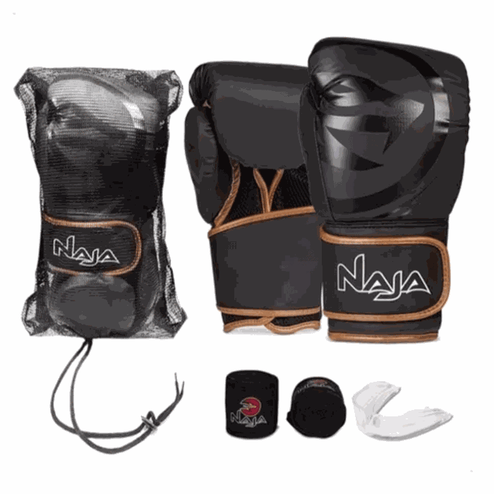 Kit luvas de Boxe Muay Thai Naja Black + Bandagem + Protetor Bucal KIT Black 12 Marrom
