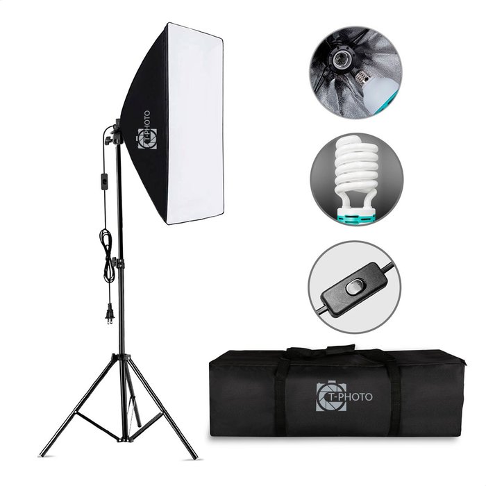 Kit Luz Contínua Softbox 50x70 + Tripé 2m + Lâmpada 220V (Equivalência de 150W) T-Photo