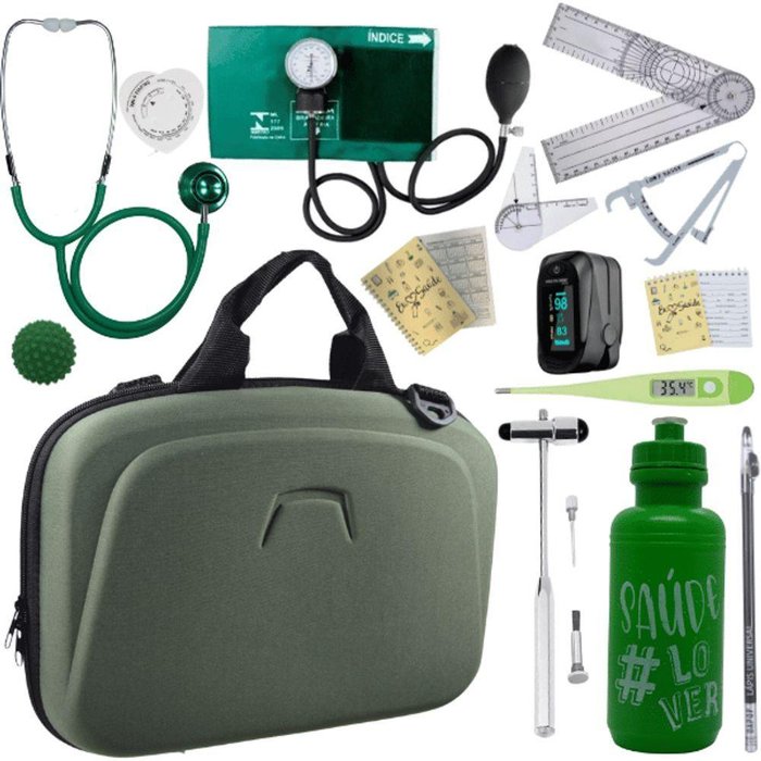 KIT COMPOSTO POR:1 MALETA MÉDICA COM ALÇA DE MÃO E OMBRO (dimensões aprox: 30x24x12cm)1 APARELHO DE PRESSÃO PREMIUM+ BOLSA DE PROTEÇÃO- Braçadeira em nylon- Garantia da Incoterm: 2 anos. 1 ESTETOSCÓPIO ADULTO DUPLO/DUOSSON P.A MED OU BIOLAND OU MULTILASER. Estetoscópio adulto duplo com ângulo de alumínio é um aparelho utilizado para amplificar sons corporais, como os sons cardíacos e os sons do pulmão, seu auscultador Duo-sonic (Duplo) permite ser usado em dupla função, com anel de metal cromado para sistema de trava do diafragma em PVC atóxico, com excelente sensibilidade para ausculta cardíaca, com sino e anel de PVC atóxico para ausculta pulmonar. 1 OXÍMETRO DIGITAL DE DEDO1 GONIÔMETRO GRANDE- Marcação de 0 a 35cm (com a régua aberta);- Composto por duas réguas, com giro de até 360º;1 GONIÔMETRO PEQUENO- Marcação de 0 a 14cm (com a régua aberta);- Composto por duas réguas, com giro de até 360º;1 MARTELO DE REFLEXO NEUROLÓGICO BUCK- Comprimento Total: 180 mm;- Largura: 58 mm.1 FITA MÉTRICA TIPO TRENA1 LÁPIS DERMATOGRÁFICO1 ADIPÔMETRO/PLICÔMETRO- Tamanho: 16cm.1 AGENDA DE ANOTAÇÕES PERSONALIZADA1 BLOQUINHO DE ANOTAÇÕES PERSONALIZADO1 SQUEEZE PERSONALIZADA1 BOLINHA DE FISIOTERAPIA;1 TERMÔMETRO DIGITAL.