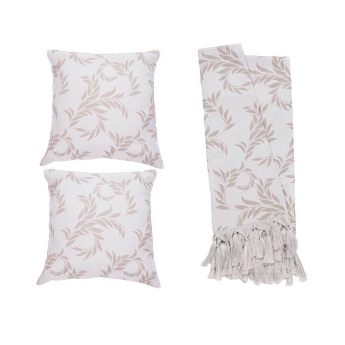 Kit Manta Rústica e Capa de Almofada para Sofá Folhas Bege e Branco Bege e Branco