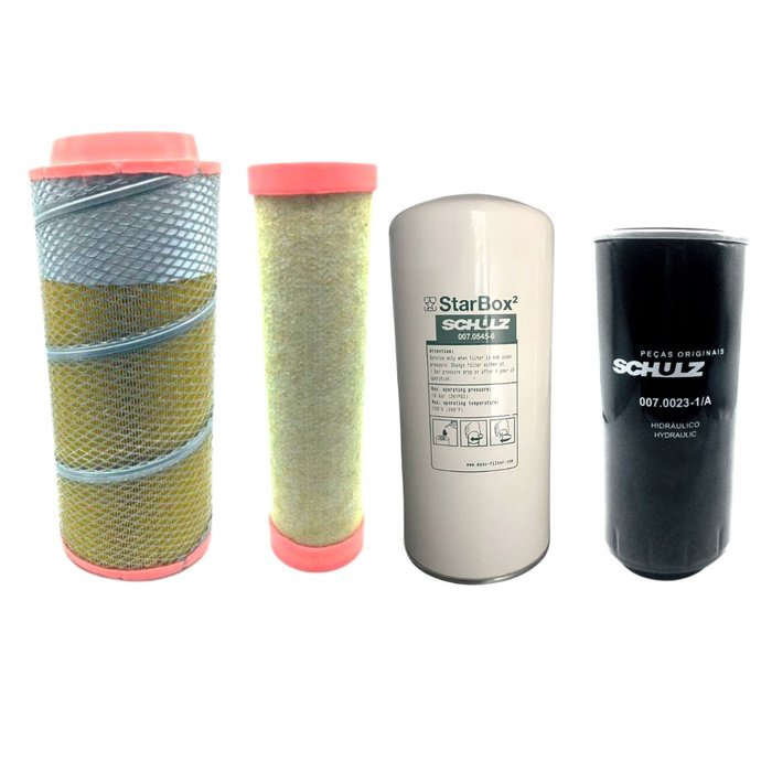 PEÇAS ORIGINAIS - COMPRESSOR ROTATIVO DE PARAFUSO SCHULZ KIT ACOMPANHA: 1) - Elemento Filtro De Ar Primário Veicular Para Compressor De Parafuso Schulz - 007.0472-0/At 2) - Elemento Filtro De Ar Secundário Veicular Para Compressor De Parafuso Schulz - 007.0473-0/At 3) - Filtro De Óleo Para Compressor Rotativo De Parafuso Schulz - 007.0023-1/At 4) - Elemento Filtro Separador Ar/Óleo Para Compressor Rotativo De Parafuso Schulz - 007.0545-0At COMPATIVEL: SRP 5050 FLEX / SRP 5060 FLEX