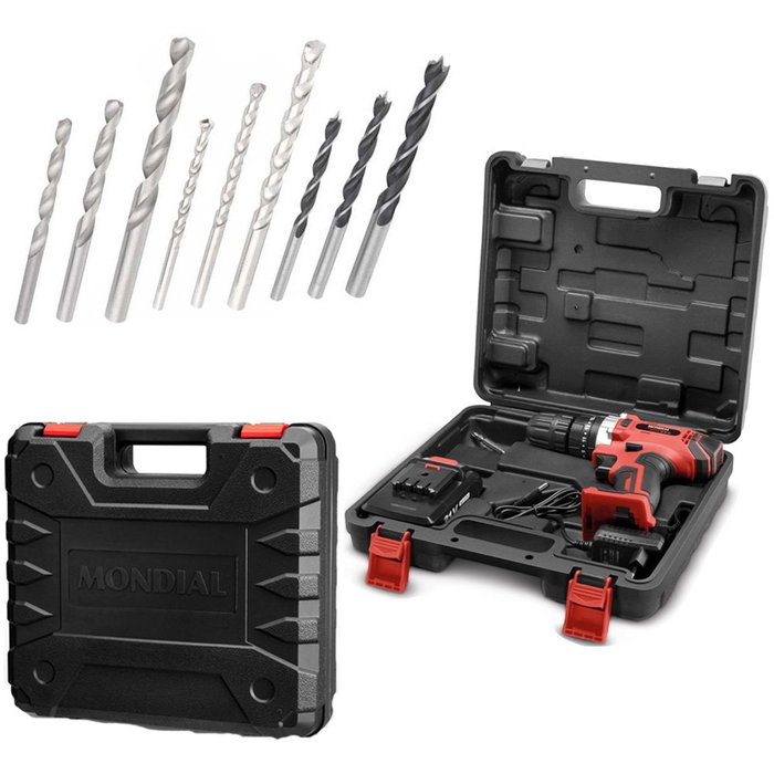 KIT MARTELETE FURADEIRA PARAFUSADEIRA 21V SEM FIO MONDIAL + JOGO DE BROCAS COMBINADAS COM 9 PEÇAS