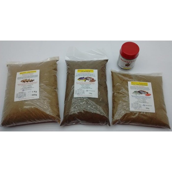 Farinha de trigo, farinha de sardinha, farinha de sangue, farinha de carne, sal, farinha de linhaça, farelo de arroz, proteína de soja, farelo de milho, óleo de peixe, açucar, missô e atrativo.
