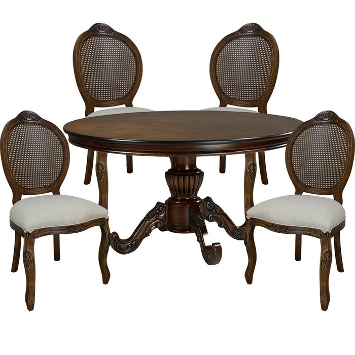 Kit Mesa 1,30 + 4 Cadeiras Medalhão Entalhadas com Telinha e Linho Rústico Bege Creme
