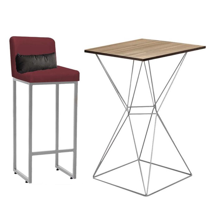 Kit Mesa Bistrô Lucca e 1 Banqueta Lucca Tampo Caramelo Ferro Prata Suede Bordô e Almofada Cinza - A