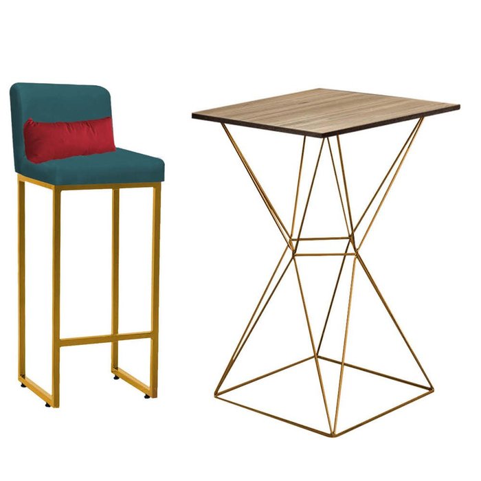 Kit Mesa Bistrô Lucca e 1 Banqueta Lucca Tampo Carvalho Ferro Dourado Suede Azul Turquesa e Almofada