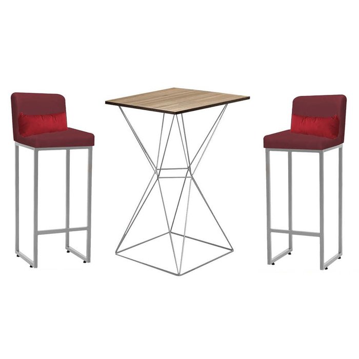 Kit Mesa Bistrô Lucca e 2 Banqueta Lucca Tampo Carvalho Ferro Prata Suede Bordô e Almofada Vermelho