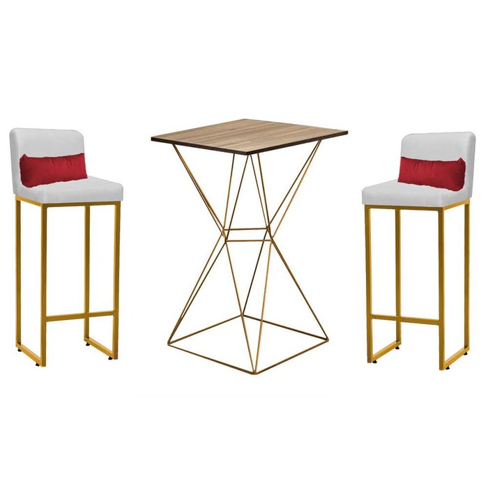 Kit Mesa Bistrô Lucca e 2 Banqueta Lucca Tampo Madeira Ferro Dourado Corino Branco e Almofada Vermel