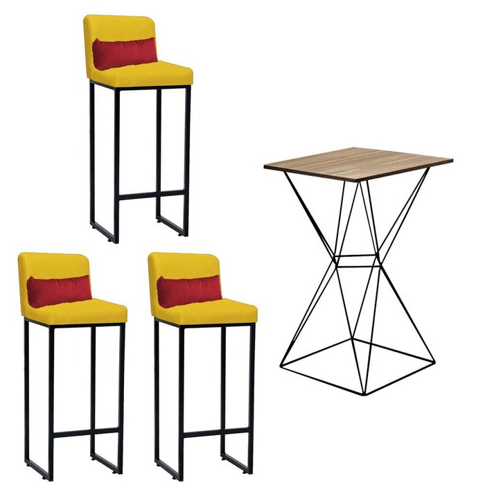 Kit Mesa Bistrô Lucca e 3 Banqueta Lucca Tampo Madeira Ferro Preto Corino Amarelo e Almofada Vermelh