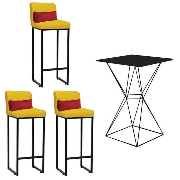 Kit Mesa Bistrô Lucca e 3 Banqueta Lucca Tampo Preto Ferro Preto Sintético Amarelo e Almofada Vermel