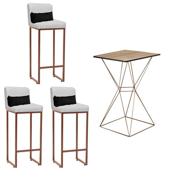 Kit Mesa Bistrô Lucca e 3 Banqueta Lucca Tampo Rústico Ferro Bronze Corino Branco e Almofada Cinza -