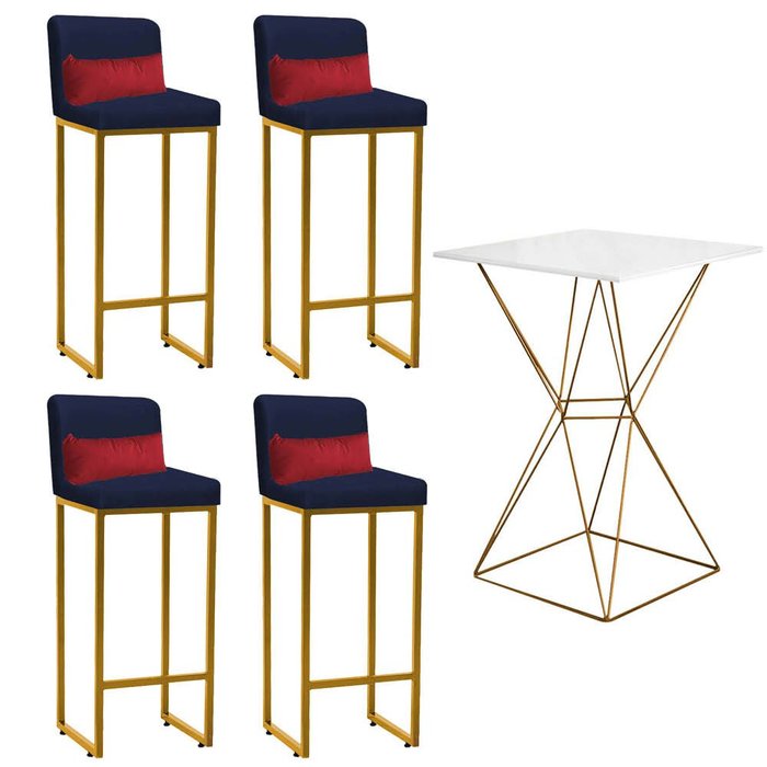 Kit Mesa Bistrô Lucca e 4 Banqueta Lucca Tampo Branco Ferro Dourado Suede Azul Marinho e Almofada Ve