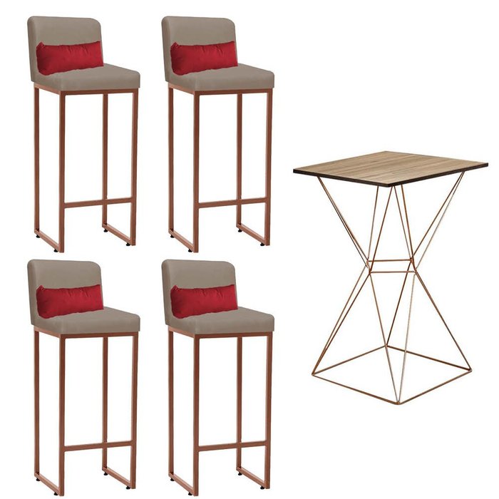 Kit Mesa Bistrô Lucca e 4 Banqueta Lucca Tampo Madeira Ferro Bronze Corino Bege e Almofada Vermelho