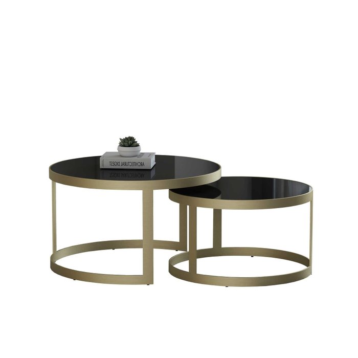 Kit Mesa de Centro Redonda Sala Tampo Vidro Preto Estrutura Aço Carbono Dourado Light Dourado
