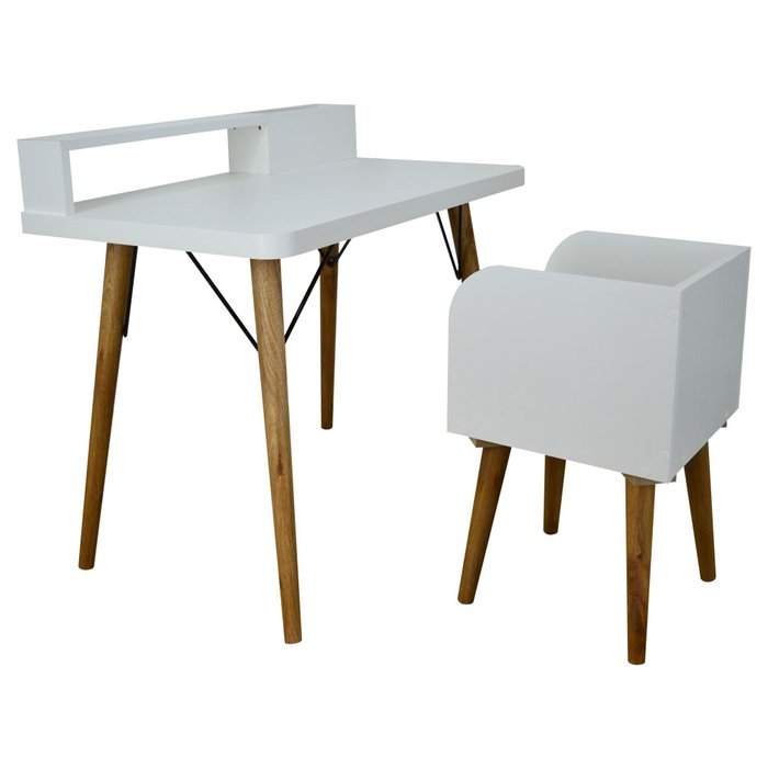 - Tampo da escrivaninha, assento e encosto da banqueta em MDF com cantos arredondados;