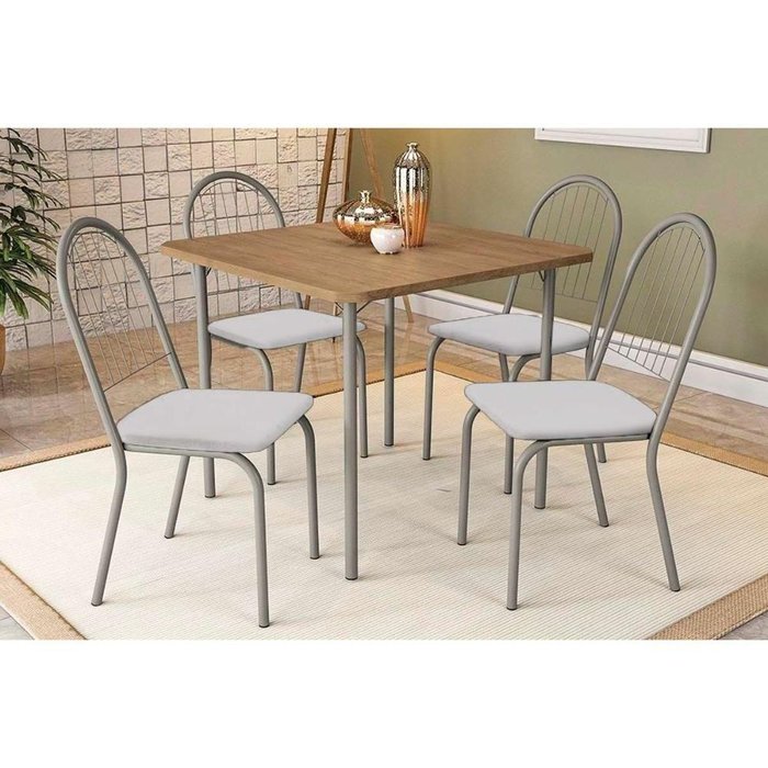 Sala de Jantar Completa Sena Níquel c/ Tampo Madeirado 90cm + 4 Cadeiras Noruega Cromado/Courano Branco - Kappesberg
