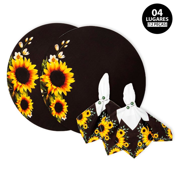 Kit Mesa Posta Sousplat 4 Lugares 12 Pçs Micropercal 200 Fios Girassol Amarelo (Capa+Guardanapo+