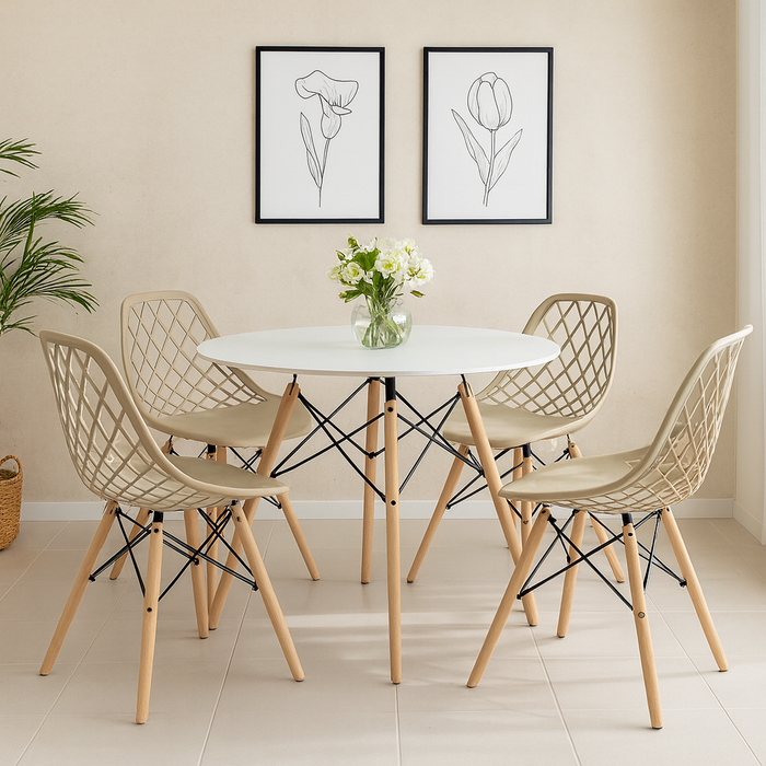Conjunto Mesa Eames 90cm com 4 Cadeiras Kaila DSW – Base em Madeira e Assento em Polipropileno