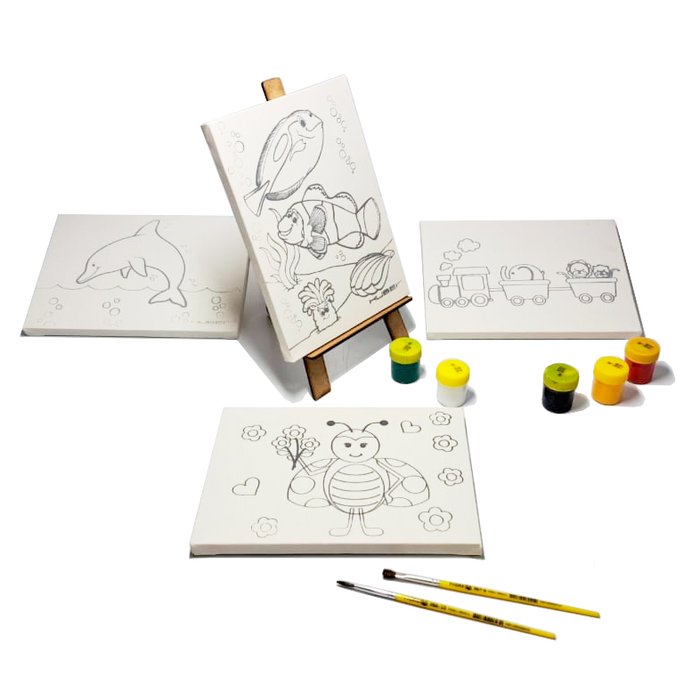 Kit Mini Cavalete + 4 Telas de Pintura Riscadas 16x22 cm + jogo de tintas guache + 2 pincéis.