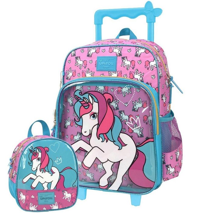 Kit Mochila com Rodinhas Up4you Unicórnio com Lancheira, é toda delicada e ideal para sua filha transportar todo o material escolar. Descrição da Mochila com rodinhas: - Dispõe de alça de mão reforçada e alça retrátil para uma melhor locomoção; - Amplo compartimento principal para melhor organização dos cadernos, livros e apostilas; - Bolso frontal transparente com fechamento em zíper; - Bolsos laterais com redinhas para transporte de garrafinhas; - Rodinhas de silicone, placa de identificação nas costas; - Confeccionada em 70% poliéster e 30% PVC e forro 100% poliéster; Tamanho/Peso - Altura: 41 cm - Largura: 30 cm - Profundidade: 14 cm - Peso: 1,200 kg Lancheira Produzida em nylon e PVC, possui alça para acoplar na mala com rodas. Puxadores personalizados. Forro interno que ajuda a manter o frescor dos alimentos por mais tempo. Obs.: acompanha porta lanches e garrafinha. Tamanho - Altura: 21 cm - Largura: 20 cm - Profundidade: 11 cm