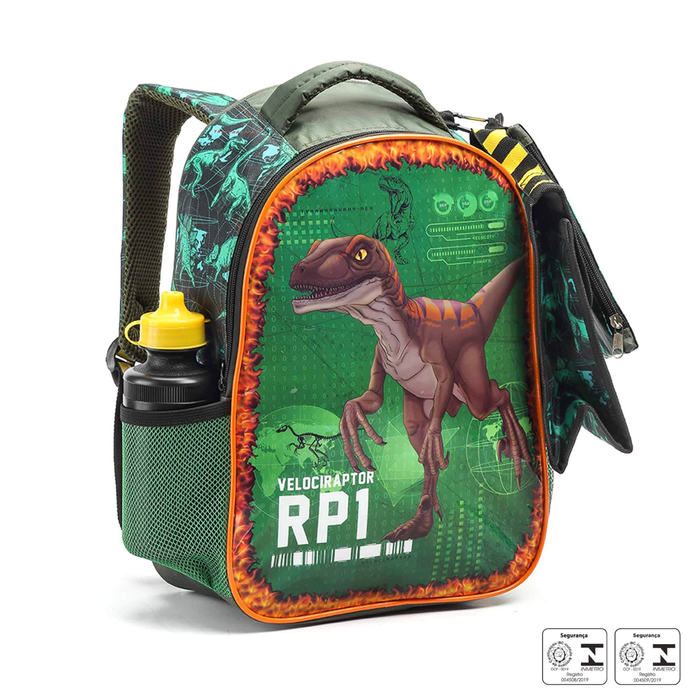 Kit Mochila Dinossauro Escolar Infantil Costas Com Lancheira + Estojo + Garrafinha:VERDE
