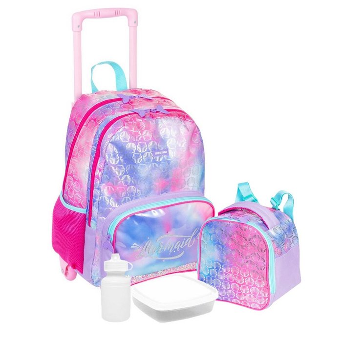 | Modelo | Kit Mochila Escolar Rodinhas Feminina Menina Juvenil Infantil X Mermaid Brilho Glitter Lilás Lancheira Térmica Impermeável Sestini |