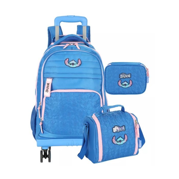 Kit Mochila Feminina Escolar Stitch Lancheira + Estojo Grande Azul