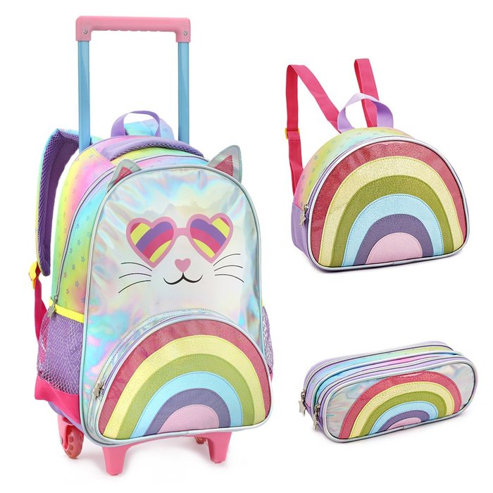 Kit Mochila Infantil Gatinha Rainbow com Orelhinhas Fofa Denlex Kt1450 colorido