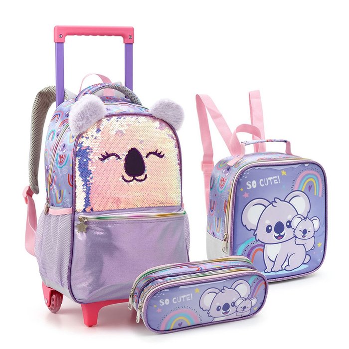 Kit Mochila Rodinhas Infantil Animais com Orelhinha Super Fofa Seanite Kt41480 Lilás