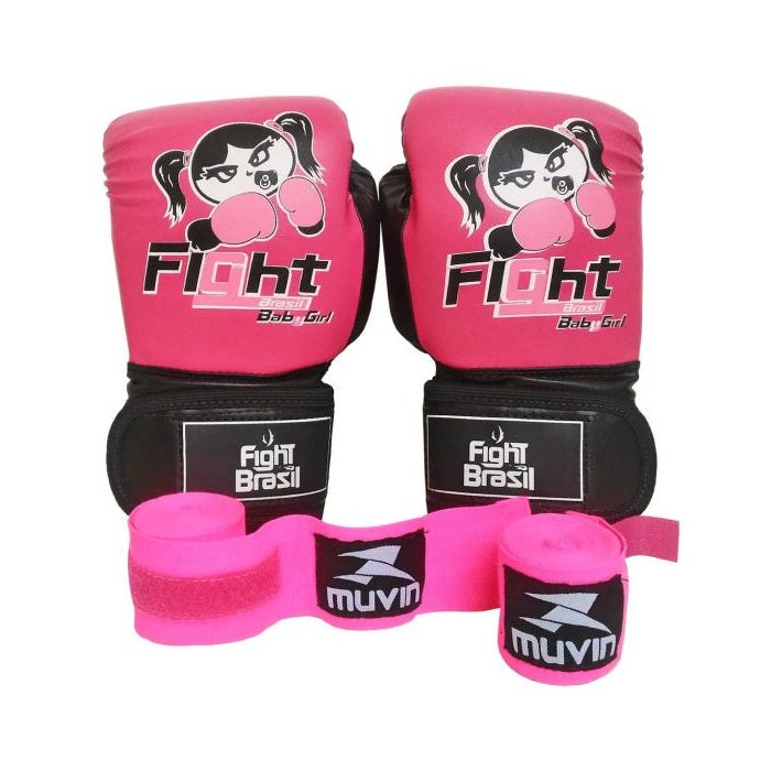 Kit Muay Thai Boxe Luva Bandagens Infantil 04 Oz Fight Brasil Feminino Rosa