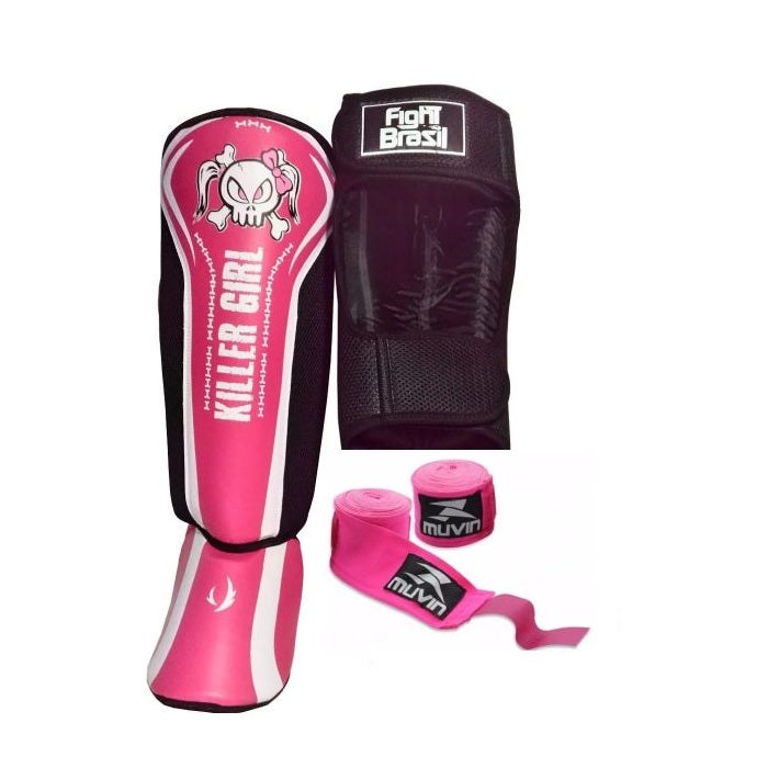 Kit Muay Thai Caneleira M Com Bandagens Fight Brasil Killer Girl Rosa Feminina.