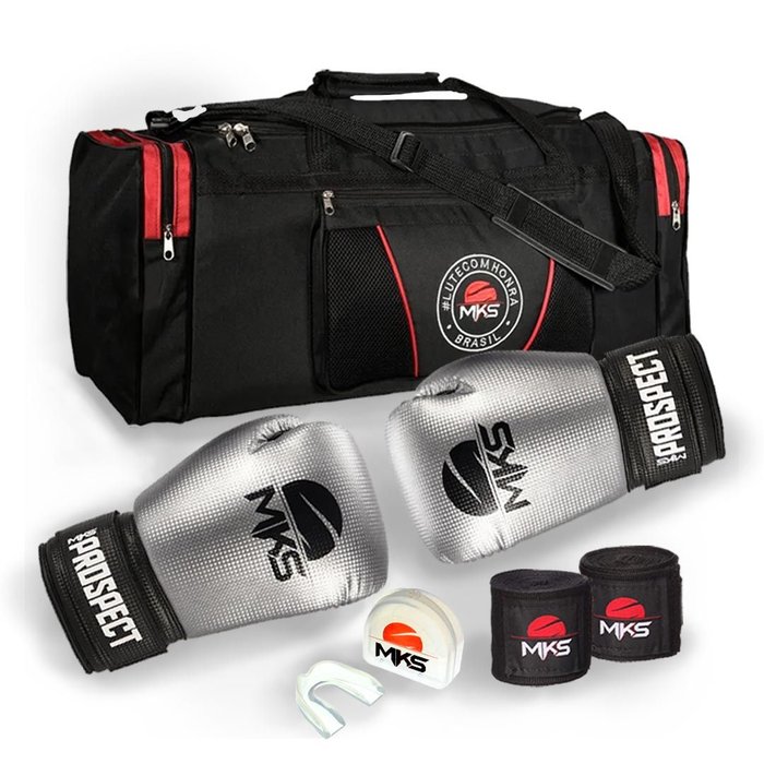 | Itens Inclusos | 1 PAR DE LUVAS MKS PROSPECT SILVER & BLACK 1 PAR DE BANDAGEM MKS 2,55m PRETA 1 BOLSA MKS ESSENTIAL BAG POLIÉSTER COM BORDADO 30x60x30cm (leva tudo!) 1 PROTETOR BUCAL MKS COM ESTOJO |