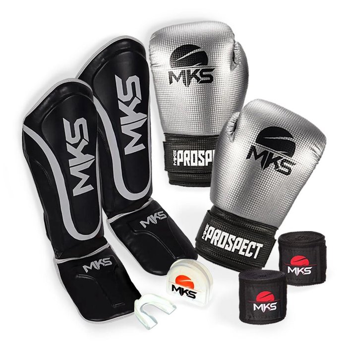 | Itens Inclusos | 1 PAR DE LUVAS MKS PROSPECT SILVER & BLACK 1 PAR DE BANDAGEM MKS 2,55m PRETA 1 PAR CANELEIRA PROSPECT 1 PROTETOR BUCAL MKS COM ESTOJO |