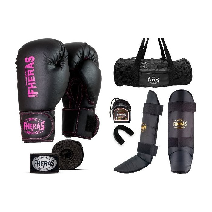 Kit Muay Thai Luva Bandagem Caneleira Bucal Bolsa Pink 12oz