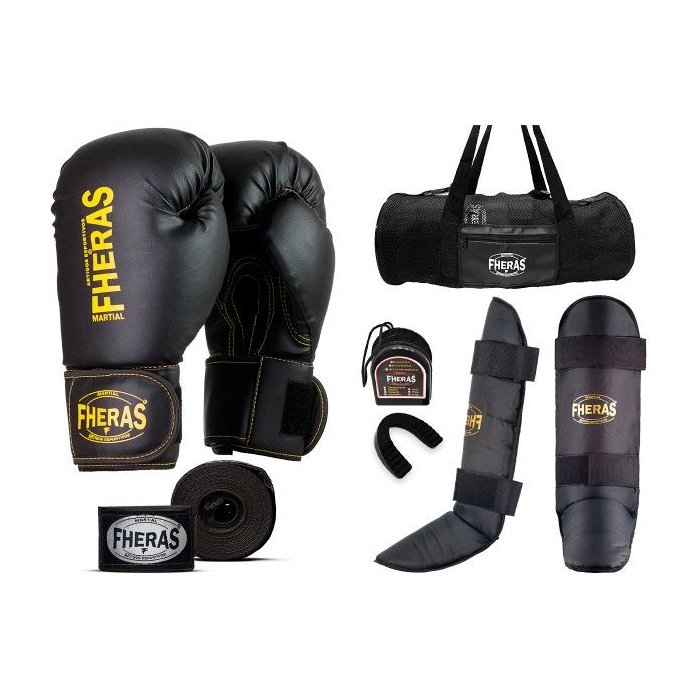 KIT MUAY THAI MMA LUVA PRO BLACK AMARELO BANDAGEM CANELEIRA BOLSA E BUCAL FHERAS