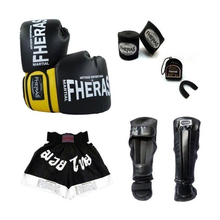 Kit Muay Thai - Luva Shorts Bucal Caneleira Bandagem - 08 OZ Preto/Amarelo